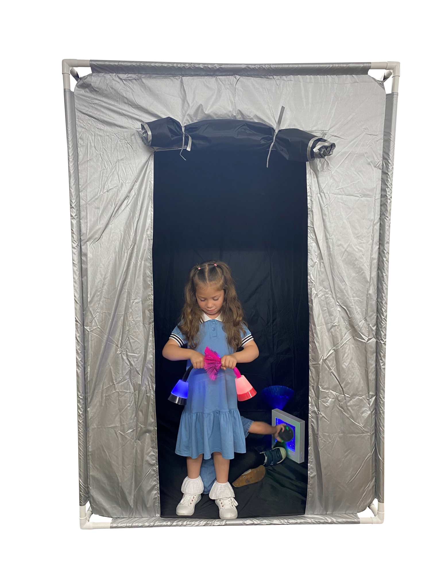ליצירת מרחב רגיעה והתנסות חשוך וגדול בחדר הכיתה. מידות: גובה 180 ס"מ  , אורך ורוחב 120 ס"מ.