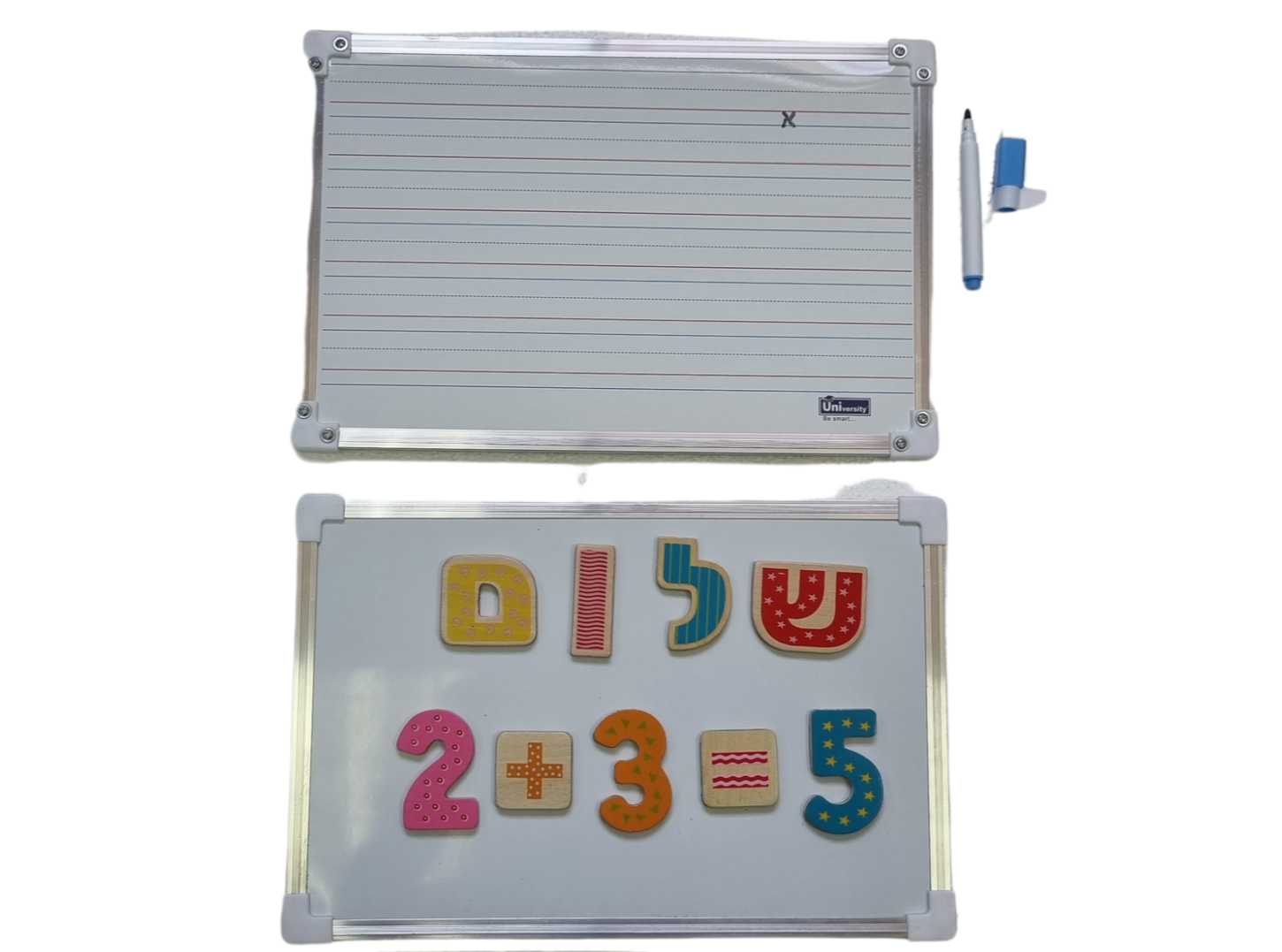 לוח חכם בגודל 30/20 סמ. בצידו האחד מחיק עם שורות לכתיבה, בצידו השני חלק, מחיק ומגנטי. כולל טוש מחיק ושני מגנטים קטנים.