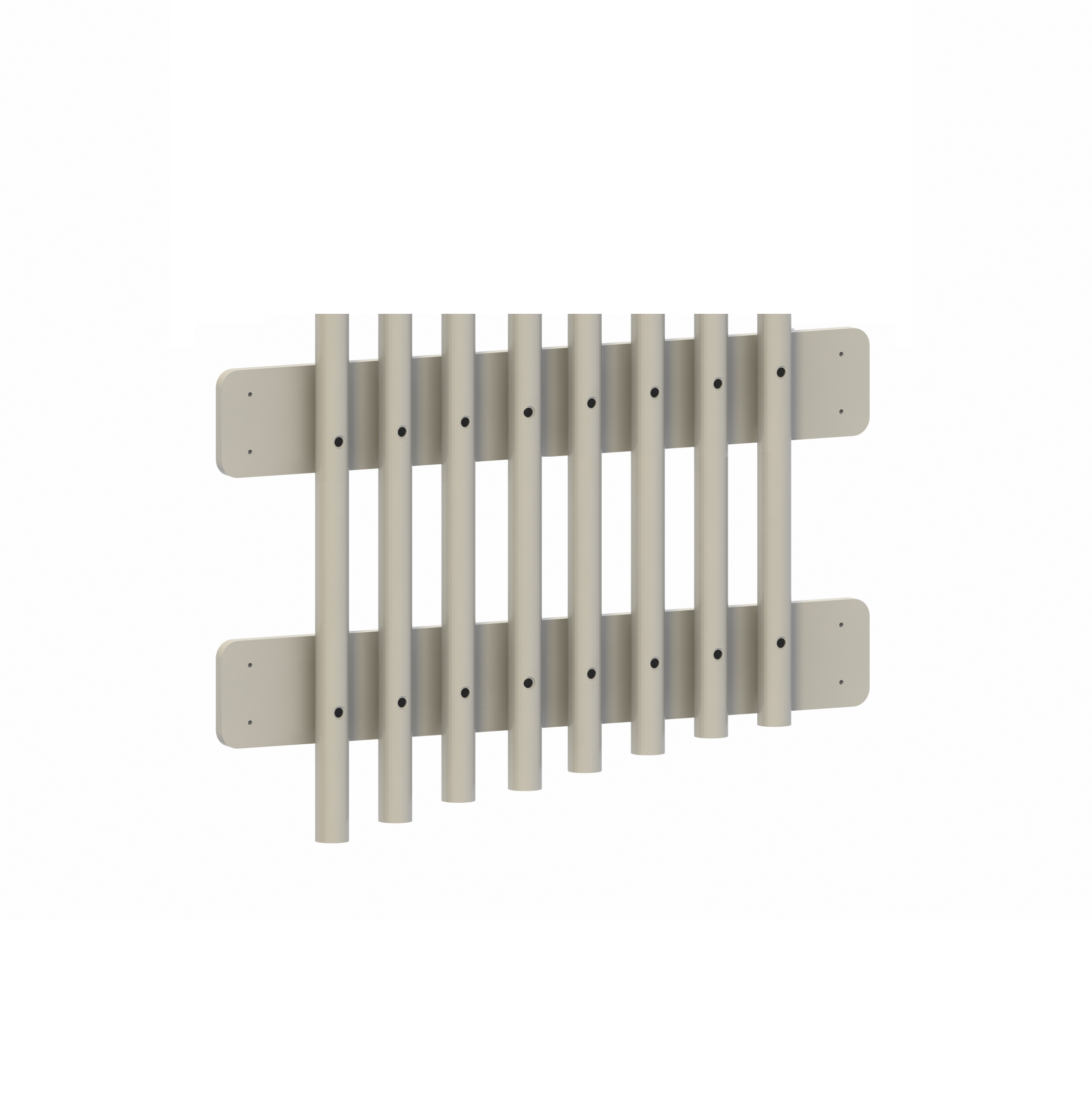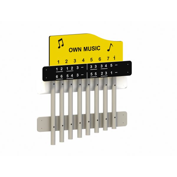 סולם צלילים מוסיקלי (צינורות אוקטבה), כולל סידור תליה לקיר וברגים , כולל כלי הקשה באורך 24 ס"מ אשר מאובטח ברצועה למתקן. ליצירת קיר מוסיקלי בגן או בבית הספר. מידות: גובה 68 ס"מ , אורך 80 ס"מ ניתן לרכוש גם מעמד לחצר כולל סולם הצלילים המוסיקלי.