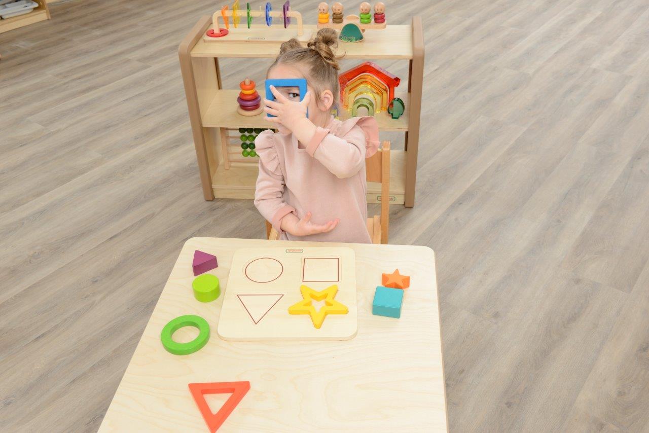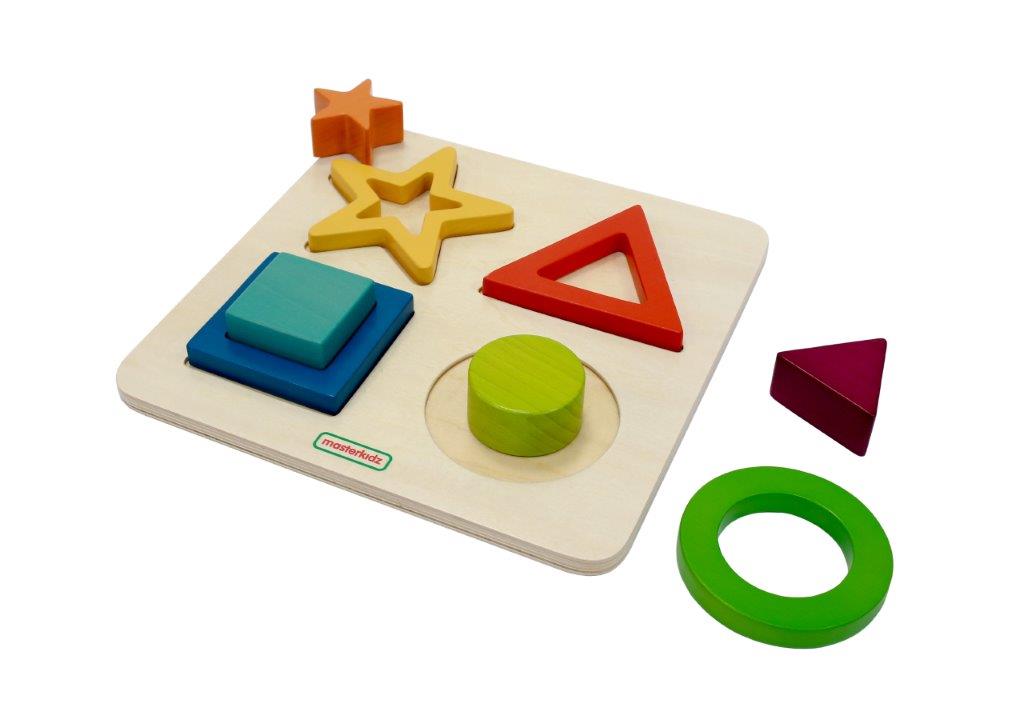 ריבוע, עיגול , כוכב ומשולש, בשני גדלים , לבנייה על הלוח ומחוץ לו. משחק חשיבה פשוט לקטנטנים.