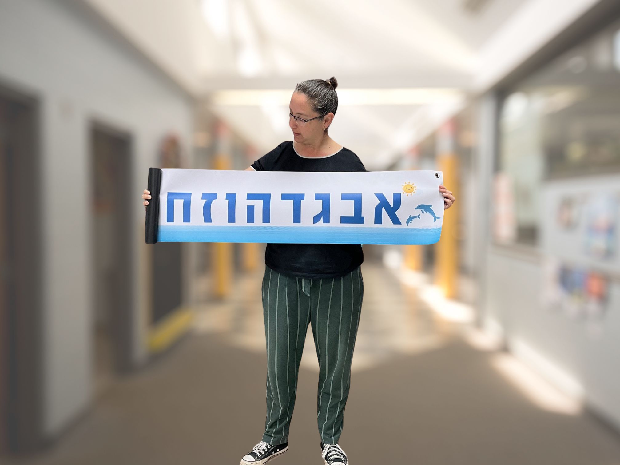 על גבי בד שמשונית כל אותיות האלף בית כולל סופיות , ניתן לניקוי במטלית לחה, נשמר לשנים, כולל טבעות לתליה.